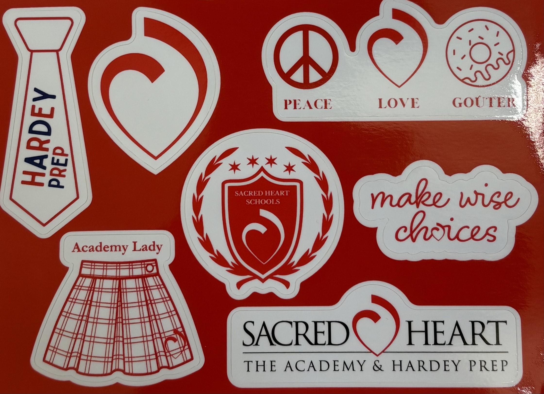 Celebrate your Sacred Heart pride with our vibrant 5×7 sticker sheet, designed to bring school spirit to life. This fun collection features the SHS logo, the Sacred Heart crest, a colorful Sacred Heart icon, a plaid skirt outline with the words “Academy Lady,” and a red tie outline with “Hardey Prep.” To top it off, a cheerful “Peace, Love, Gouter” sticker adds a playful touch perfect for students, alumni, and families alike.